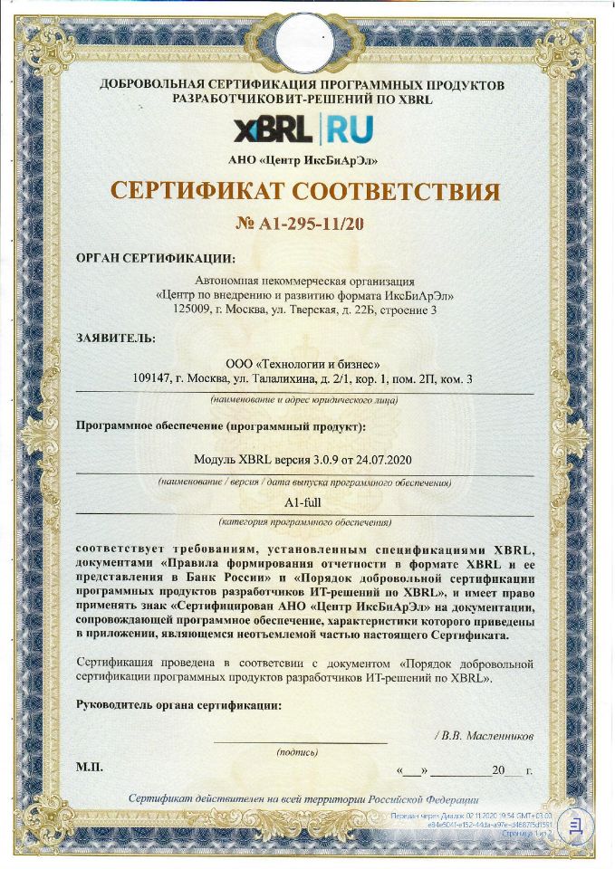 Технологии и бизнес Сертифицированный вендор юрисдикции XBRL International в России